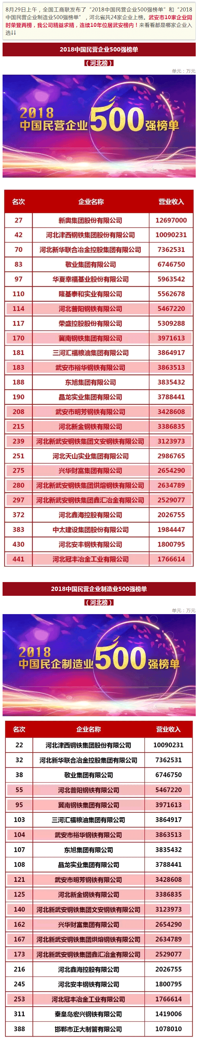 鑫匯公司榮登中國民營企業500強,武安市10家企業榮登兩榜